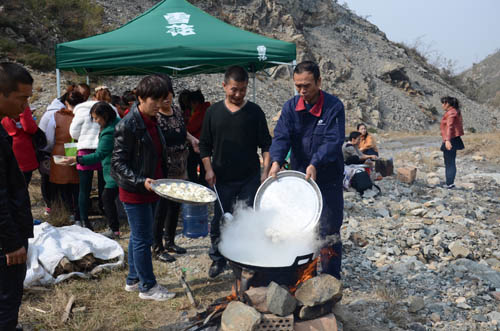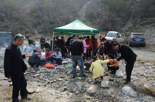大約1個(gè)小時(shí)的時(shí)間,大家紛紛從山上下來,到達(dá)野炊地點(diǎn)開始共同制******心大餐。同志們熱情高漲,分工明確,一幅其樂融融的景象,不一會兒,愛心大餐便已出鍋,大家品嘗著自己的勞動成果,感覺格外香甜。