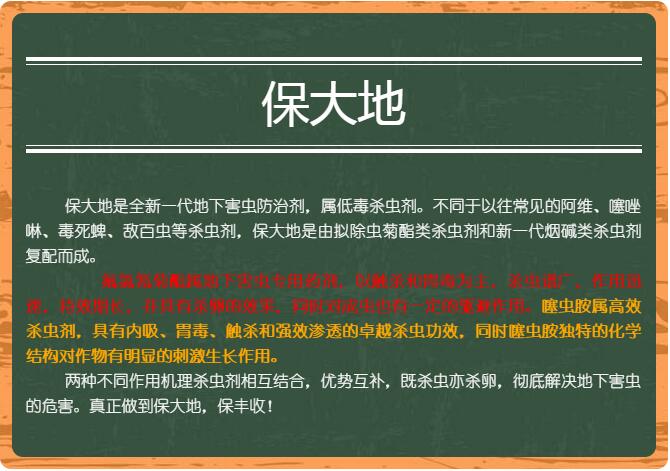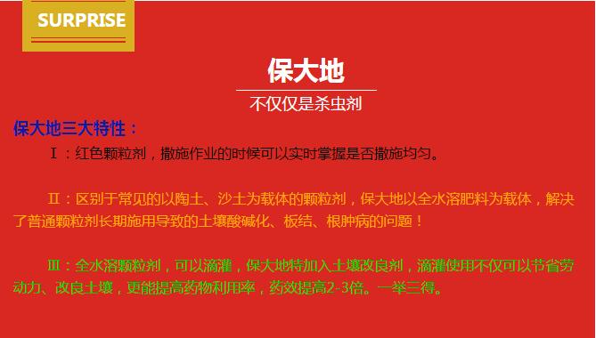 2、土壤處理:撒施顆粒劑,每畝使用保大地2-3袋,于傍晚時分均勻施撒于地面,可確保地下害蟲晚上出土時******殲殺。