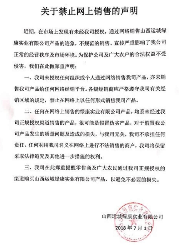 近期,我山西運(yùn)城綠康工作人員在市場(chǎng)上發(fā)現(xiàn)有未經(jīng)我公司授權(quán),在網(wǎng)絡(luò)上銷售我司產(chǎn)品的跡象,為保護(hù)及廣大客戶的合法權(quán)益不受侵害,我公司特作一下聲明文件,詳見具體文件: