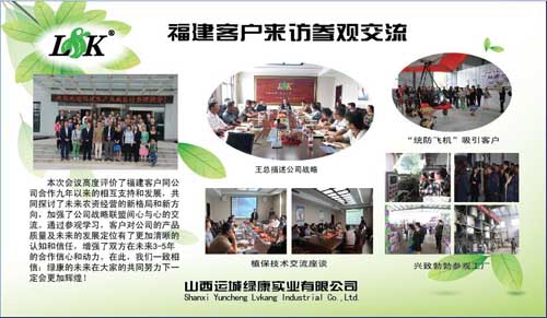 為加大客戶(hù)與公司之間的信任度,增加銷(xiāo)量,2014年9月23日,閔北區(qū)業(yè)務(wù)經(jīng)理陳鋒帶領(lǐng)福建客戶(hù)來(lái)綠康公司參觀學(xué)習(xí),由技術(shù)總監(jiān)薛工帶領(lǐng)大家參觀生產(chǎn)工廠。首先參觀了我公司用于統(tǒng)防統(tǒng)治的美國(guó)三角翼,為了貼合******統(tǒng)防統(tǒng)治的植保理念,為了提高防治病蟲(chóng)害效果,綠康公司于2012年成立了統(tǒng)防統(tǒng)治合作社,并購(gòu)置美國(guó)原裝進(jìn)口塔瑞斯MA-34R528XB農(nóng)藥噴灑飛機(jī)五架??蛻?hù)在參觀飛機(jī)后對(duì)公司先進(jìn)的植保理念表示贊賞。
